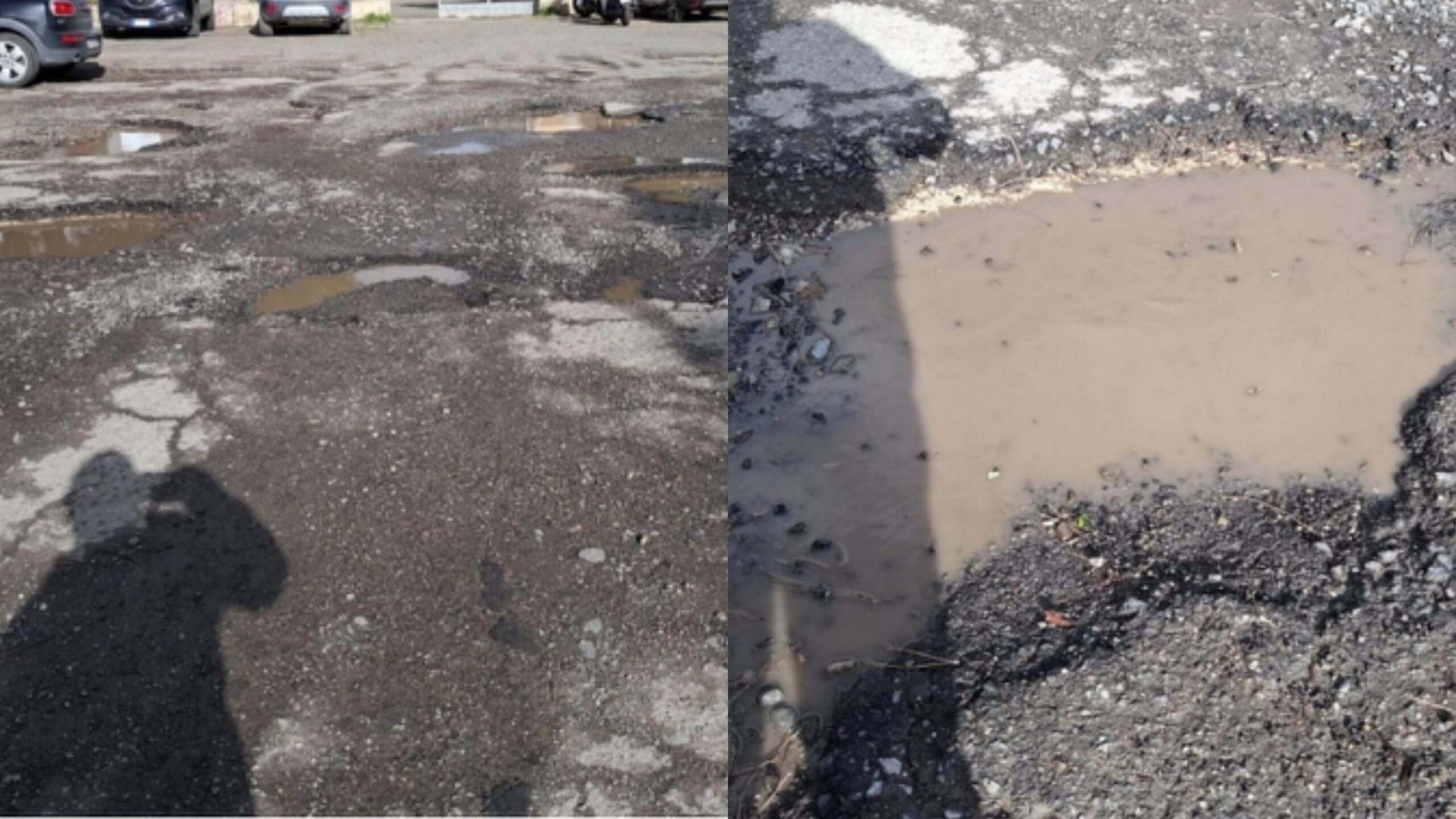 Condizioni di totale abbandono dell’area a due passi dalla scuola, sono presenti voragini profonde, buche nell’asfalto con una profondità stimata tra i 15 e i 20 centimetri, che diventano invisibili e ancor più pericolose in caso di pioggia.