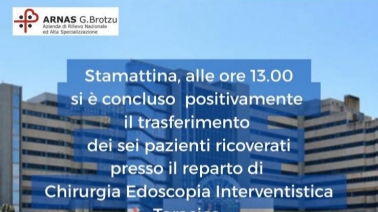 Si è concluso oggi, alle ore 13, il trasferimento dei sei pazienti ricoverati presso il reparto di Chirurgia Edoscopia Interventistica toracica del presidio ospedaliero Businco, come comunicato dalla direzione dell’Arnas Brotzu. “Stamattina, alle ore 13, si è concluso positivamente il trasferimento dei sei pazienti ricoverati presso il reparto di Chirurgia Edoscopia Interventistica toracica del p.o. Businco. I degenti, come da programma, sono stati accolti al settimo piano del p.o. San Michele, presso il reparto chirurgico multidisciplinare, dove potranno ricevere da stasera le visite dei loro familiari”, ha dichiarato l’ospedale in una nota ufficiale.