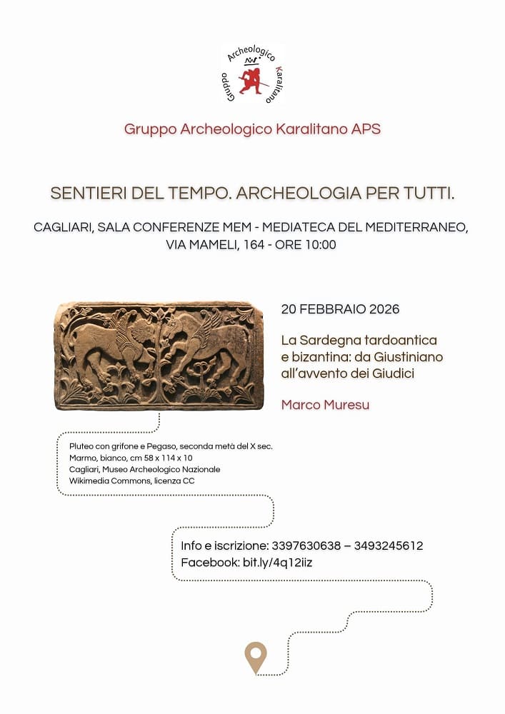 Si chiude questo venerdì (20 febbraio) “Sentieri del tempo. Archeologia per tutti”, il ciclo di conferenze promosso a Cagliari dal GAK – Gruppo Archeologico Karalitano, con il contributo dell’Ufficio di Presidenza del Consiglio Regionale della Sardegna. L’ultimo incontro – in programma come sempre alla MEM – Mediateca del Mediterraneo (in via Mameli, 164) con inizio alle 10 – è affidato a Marco Muresu, ricercatore in Archeologia Cristiana e Medievale presso l’Università di Cagliari, che proporrà una lettura aggiornata della Sardegna tardoantica e bizantina, da Giustiniano all’avvento dei Giudici: un periodo spesso percepito come marginale, ma in realtà decisivo per comprendere continuità, trasformazioni e connessioni dell’isola nel Mediterraneo. Come tutte le precedenti, anche questa conferenza (la cui registrazione sarà poi disponibile sul canale YouTube @GAKGruppoArcheologicoKalaritan) è aperta al pubblico gratuitamente, con la possibilità di offrire un contributo volontario a sostegno delle attività del Gruppo Archeologico Karalitano.