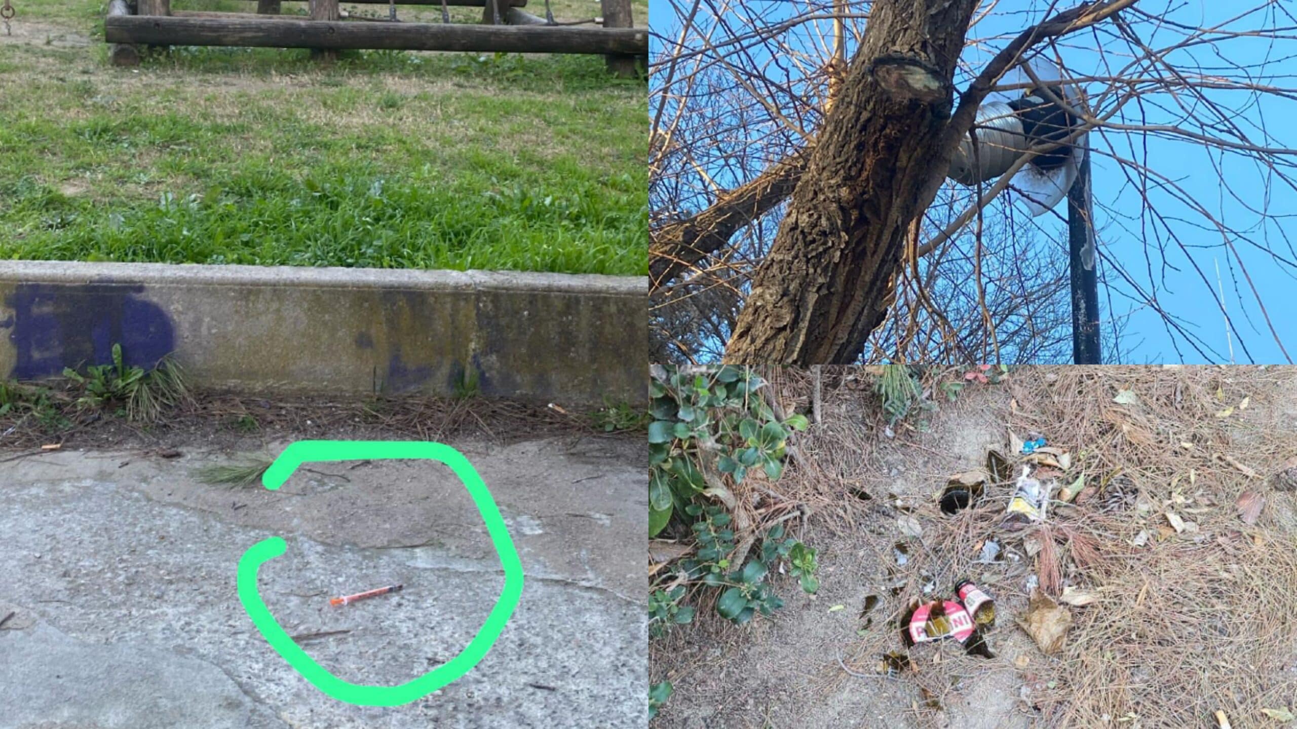 L’area verde è resa degradata anche dalle deiezioni degli animali nello stesso luogo in cui giocano i bambini. I giochi per bambini e gli arredi esistenti risultano inadeguati e spesso danneggiati, una condizione che evidenzia la mancanza di un reale controllo e dell’assenza di un presidio di sicurezza capace di prevenire i fenomeni di degrado e inciviltà.
