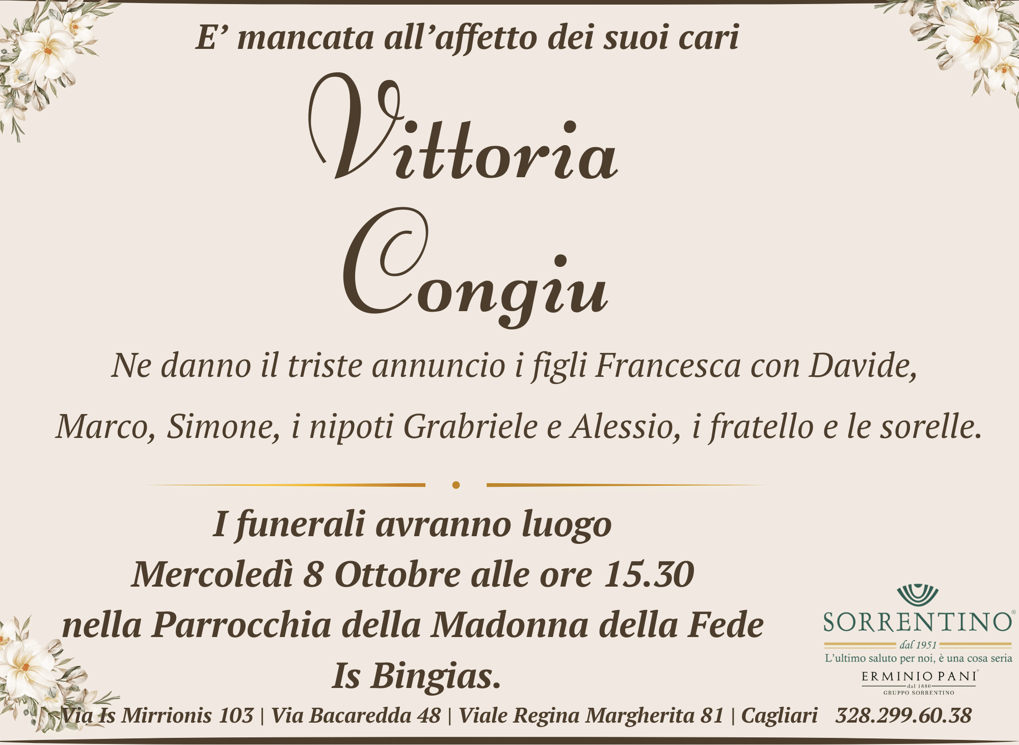 I funerali avranno luogo Mercoledì 8 Ottobre alle ore 15.30