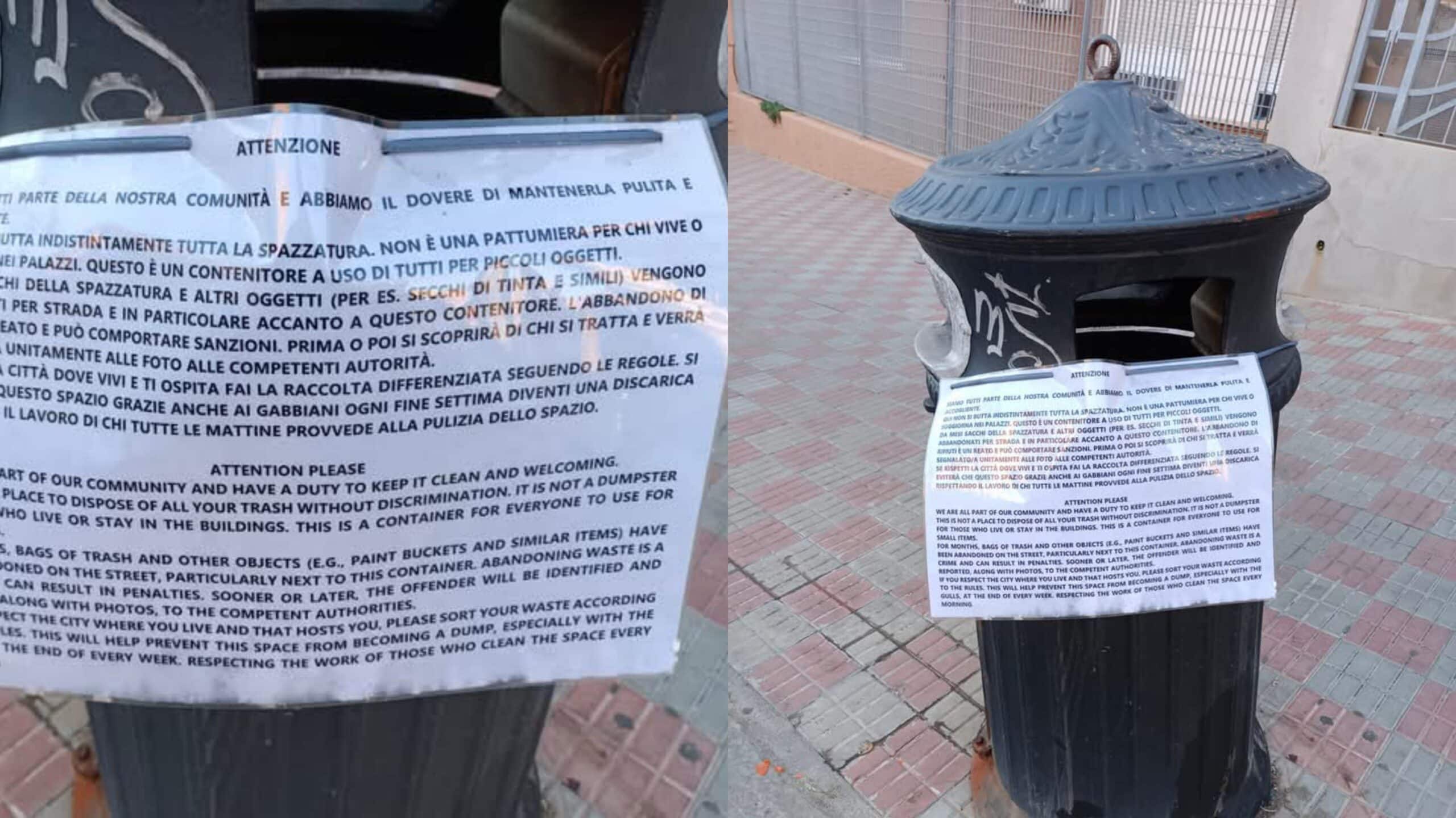 Una scritta in Italiano e in inglese per ricordare le buone norme al fine di evitare che il luogo, come spesso accade, si trasformi in una discarica. Da mesi il cestino preposto per raccogliere cartacce e fazzoletti viene usato come bidone di immondizia non prodotta di certo in strada: “Secchi di tinta e simili vengono abbandonati per strada e in particolare accanto a questo contenitore. L’abbandono di rifiuti è un reato e può comportare sanzioni. Prima o poi si scoprirà di chi si tratta e verrà segnalato unitamente alle foto alle competenti autorità. Se rispetti la città dove vivi e ti ospita fai la raccolta differenziata. Si eviterà che questo spazio grazie anche ai gabbiani ogni fine settimana diventi una discarica rispettando il lavoro di chi tutte le mattine provvede alla pulizia dello spazio”. Semplici regole che se fossero adottate da tutti non ci sarebbe bisogno di ricordare, eppure la necessità è palese in quanto le segnalazioni del degrado che spesso affligge la città, in generale, fioccano giorno dopo giorno.
