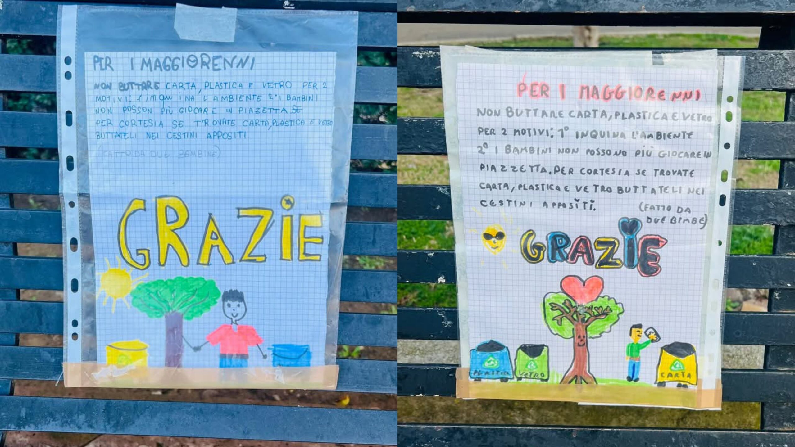 Volevano solo correre con i pattini in quella piazzetta vicino a casa, ma al loro arrivo una distesa di rifiuti, cocci di vetri soprattutto, ha impedito il momento di svago. Cambio di programma, quindi, e, assieme ai genitori, hanno mollato i giochi per dedicarsi alla pulizia del luogo. Non solo: hanno disegnato due cartelli per chiedere il rispetto verso l’ambiente e gioco dei bambini, necessario per loro, come la pulizia dei luoghi comuni.
