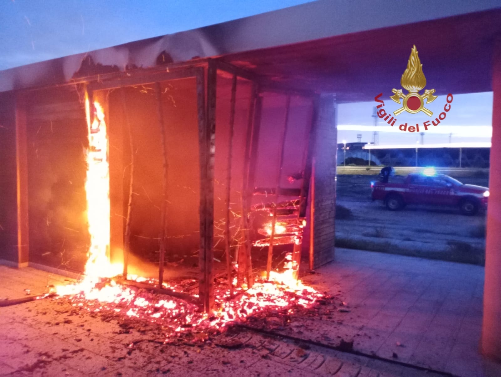 Cagliari, incendio di un casotto, alle prime luci dell’alba, sotto una pensilina dei servizi pubblici in un’area nel quartiere di Sant’Elia.