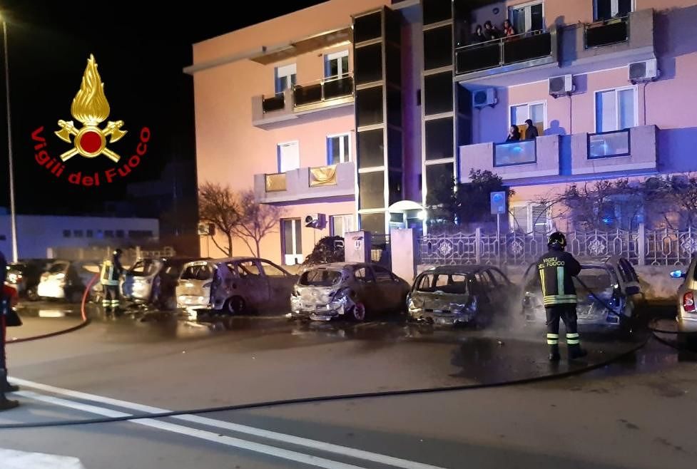Intervento di tre squadre dei vigili del fuoco del comando di Cagliari nella notte, in zona Poetto, in via Montecristo per un incendio che ha coinvolto 8 auto parcheggiate lungo la via.