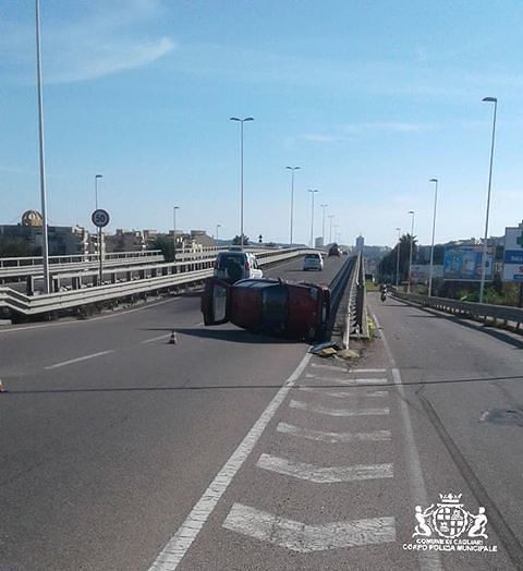 Incidente stradale nel primo pomeriggio nella SS 131 racc. in direzione asse mediano direzione aeroporto all’altezza della bretella di immissione che porta alla rotonda Peretti/Stamira. Per cause in corso di accertamento, una Fiat 600 guidata da un 58enne cagliaritano ed una Fiat punto condotta da un 20enne di Cagliari si sono scontrate lateralmente. La 600 è finita sullo spartitraffico che separa la SS 131 dire e la bretella di immissione e dopo l’urto si è ribaltata lateralmente. Per fortuna nessun ferito. Sul posto la Polizia Municipale per i rilievi del caso