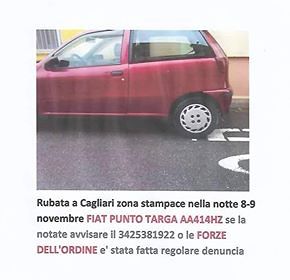 Sos per ritrovare un’auto rubata. Chiede aiuto un nostro lettore al quale la notte fra l’8 e il 9 novembre è stata rubata una Fiat Punto (che vedete in foto) dalla zona di Stampace.