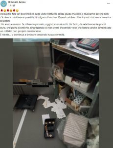 Ennesimo colpo in un’attività commerciale di Cagliari, stavolta a pochi metri di distanza dal mercato civico di San Benedetto, in via Monti. I malviventi sono entrati in azione nella gelateria Aresu, riuscendo a scappare con pochi euro. A denunciare il fatto con un post sulla pagina ufficiale di Facebook sono le stesse titolari del locale, tra le gelaterie che restano attive in città anche in autunno: “Volevamo fare un post ironico sulle visite notturne senza guida ma non ci riusciamo perché non c’è niente da ridere e questi fatti tolgono il sorriso. Quando violano i tuoi spazi ci si sente inermi e spiazzati. Un anno e mezzo fa ci hanno provato, oggi ci sono riusciti”, spiegano, sconfortate, le titolari della gelateria. Via Monti è una strada poco frequentata, dopo una certa ora, soprattutto quando si abbassano le serrande dei pochi negozi tra l’angolo con via Tiziano e quello con via Manzoni.