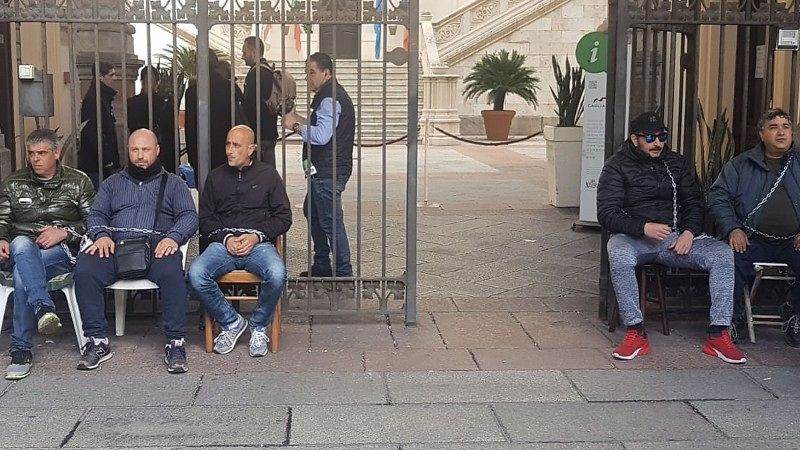 Promessa fatta e mantenuta. I diciotto ex lavoratori della De Vizia, da mesi senza stipendio, si sono incatenati ai cancelli del palazzo del Comune in via Roma. Non solo: hanno pure iniziato uno sciopero della fame a oltranza. Dalla politica, spiegano, “sono arrivate solo promesse ma mai nessun fatto concreto. Il capitolato d’appalto parla chiaro, il Comune può e deve vigilare sulle clausole presenti nel contratto”. Così, dopo due mesi in tenda, arriva il gesto choc: sciopero della fame e catene.