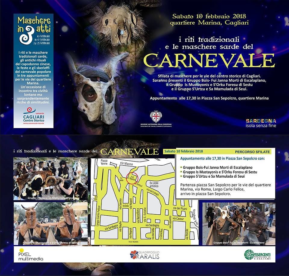 Cagliari, grande sfilata di Carnevale questa sera con le maschere di Seui ed Escalaplano. Dopo il 2008, 2015, 2016, 2017 anni di manifestazioni convegni mostre e sfilate, anche nel 2018 si inizia.