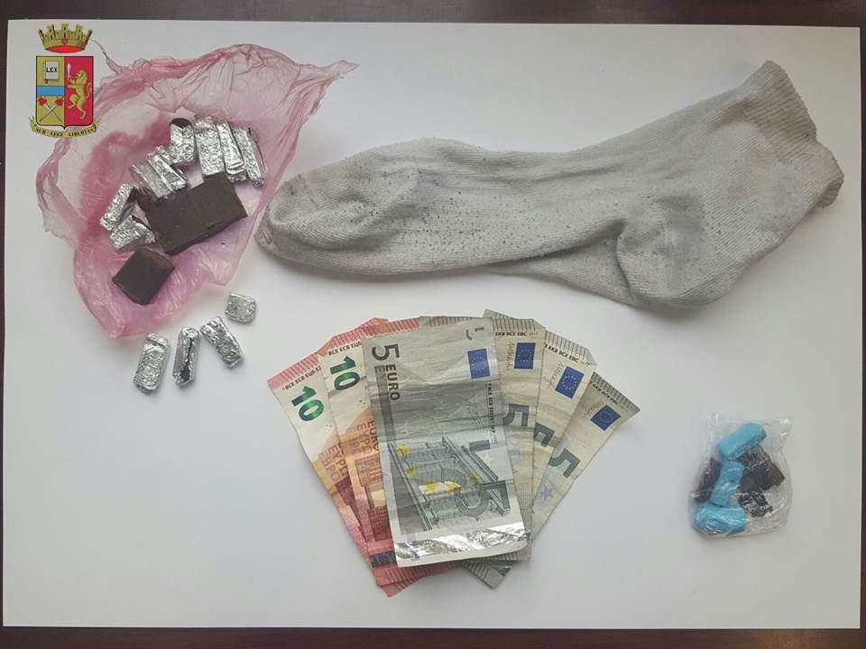 Gli Agenti sono prontamente intervenuti bloccando Mustapha che ha estratto la mano dalla tasca lasciando cadere a terra un piccolo involucro che è stato recuperato; al suo interno erano custodite 7 stecche di Hashish per il peso di grammi 7,40. Nel frattempo GIBBA ha cercato di allontanarsi con passo celere verso via Roma ma è stato fermato e sottoposto a perquisizione personale che ha permesso di recuperare 3 stecche di Hashish del peso di 1 grammo ciascuna e una banconota da euro 5,00 (nella tasca dei pantaloni) mentre nel portafoglio è stata rinvenuta la somma di euro 35,00 suddivisa in banconote di vario taglio. In un calzino indossato da Gibba sono stati rinvenuti 9 pezzi di Hashish dal peso di circa un grammo ciascuno e 3 pezzi della medesima sostanza avvolta in un involucro in cellophane per un peso di circa 33 grammi.