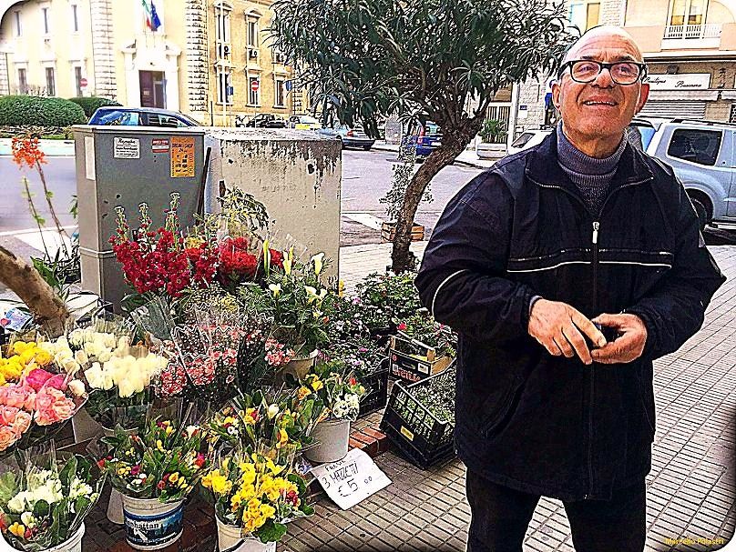 Fresie petalose? “3 mazzetti 5 Euro”. “Rosselline a soli 4 euro” e sono di quelle “belle carnose e vellutate”. Così recitano i testi dei suoi cartelli: scritte eleganti con l’inchiostro blu, eppure in pochi se ne curano; la gente fila dritta, “non sempre compra. Anzi, acquista i fiori sempre più raramente”. Parola di Bruno Leoncini, storico fioraio di Cagliari che diventa il nostro personaggio del giorno. Non ha una sede signor Bruno, come in tanti lo chiamano con grande rispetto. Non ha un negozio e vende per strada. Di strade ne ha viste tante il signor Leoncini. Da 41 anni lavora in piazza XX Settembre ed anche oggi lo troviamo qui, all’angolo – sferzato dal vento e baciato dal sole – con via Sonnino. Passa un notaio, accanto ai vasi posti sul ciglio della strada, passa un avvocato che scompare in un vicino portone. Leoncini dialoga con chi si ferma per scambiar due chiacchiere. Passano una bella “pivella” con il suo amoroso, mano nella mano, lo sguardo della ragazza cade sulle rose rosse. “Non ci sono più gli uomini d’una volta che regalano i fiori alle donne, sa…” afferma il fioraio. Lui, che fin da ragazzo lavora in questo campo, tra i fiori e l’asfalto, che di fiori ne ha venduto e regalato tanti. Matrimoni, ricorrenze sacre, relazioni, ancora qualche tempo fa, venivano suggellate anche dai fiori freschi.