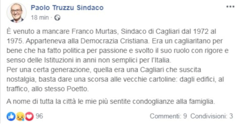 È morto Franco Murtas, sindaco di Cagliari dal 1972 al 1975. “Apparteneva alla Democrazia Cristiana, – afferma il sindaco Paolo Truzzu – era un uomo per bene e svolse il suo ruolo con rigore e senso delle istituzioni in anni non semplici per l’Italia. Sopratutto fece politica per passione. Mi piace ricordarlo”. Franco Murtas è stato assessore comunale con la giunta Brotzu dal 1961 al 1965, poi con la giunta De Magistris dal 1967 al 1969. Nel 1971 ancora assessore con la giunta Lai e nel 1973 con la giunta Fanti. Poi sindaco di Cagliari dal 1972 al 1975.