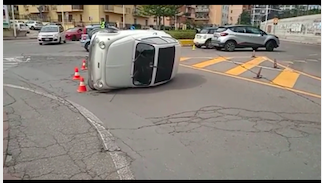 Un’auto, per cause in corso di accertamento, si è ribaltata su un fianco nei pressi della rotatoria che da via dell’Abbazia immette in via dei Conversi,