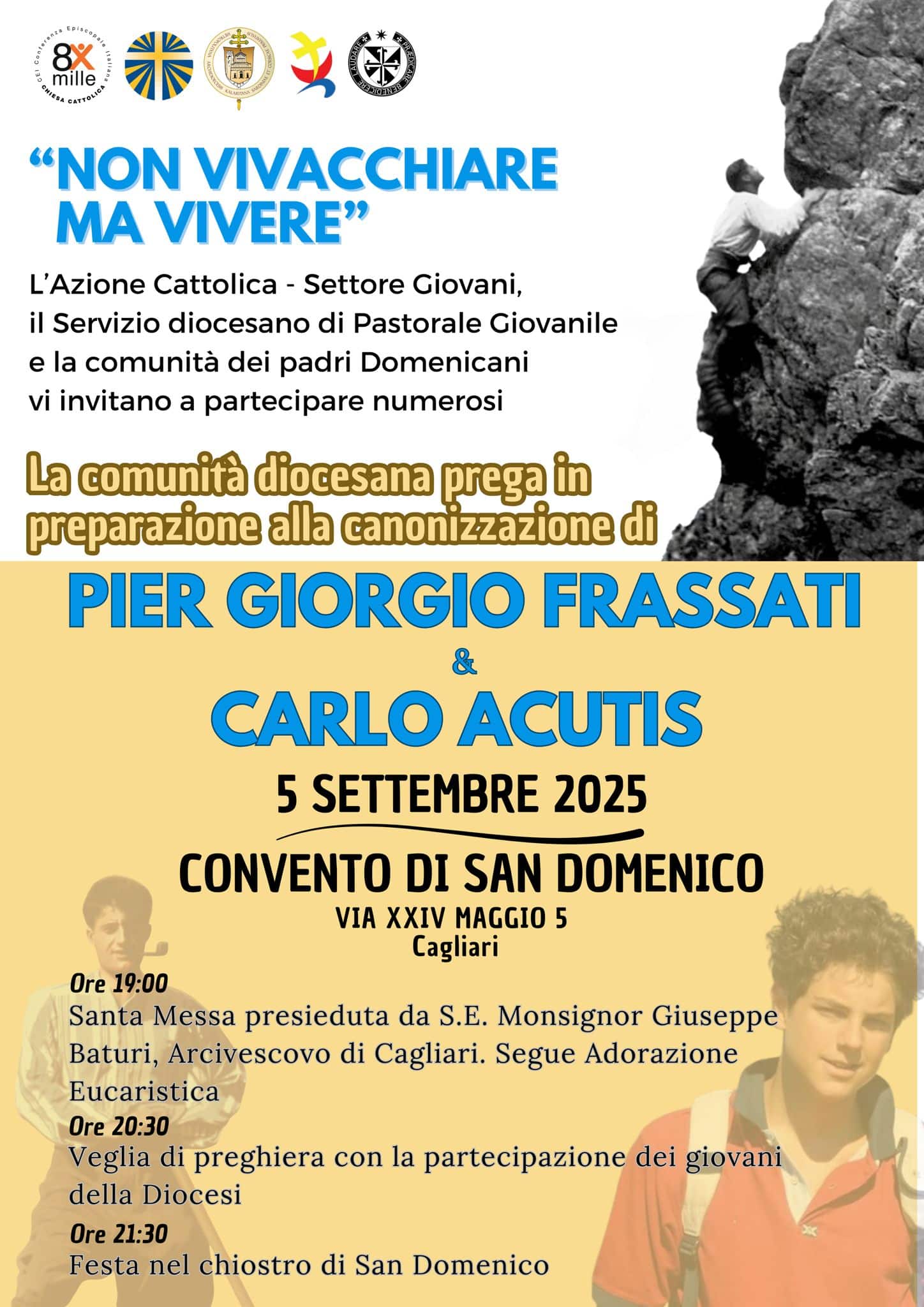 Venerdì 5 settembre 2025 la diocesi di Cagliari vivrà un momento speciale di preghiera in attesa della canonizzazione di Carlo Acutis e Piergiorgio Frassati, due giovani testimoni della fede che domenica 7 settembre saranno proclamati santi. L’appuntamento è nel convento di San Domenico a Cagliari (via XXIV Maggio, 5), promosso dall’Azione Cattolica – settore giovani, dalla Pastorale giovanile diocesana e dalla comunità dei padri domenicani.