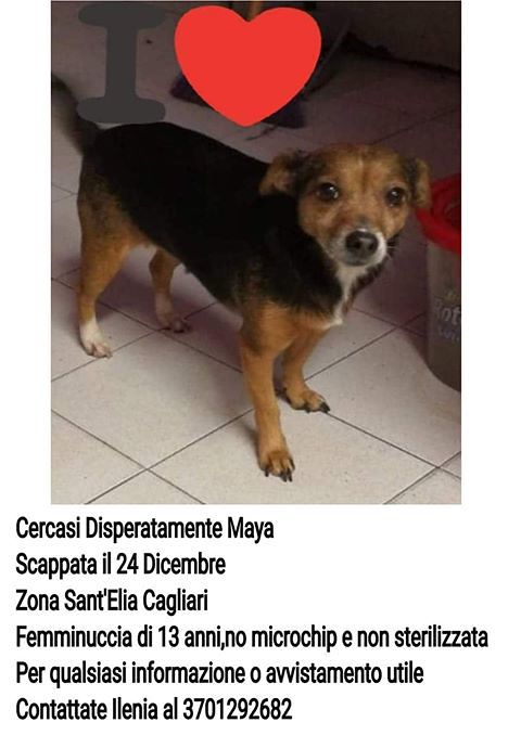 Maya ha 13 anni, non si hanno più notizie dal 24 dicembre. L’appello della padrona per la rubrica Zampetta Sarda Online: “La cerchiamo disperatamente, aiutateci a ritrovarla.” Chi dovesse avvistarla può contattare il numero riportato nella foto.