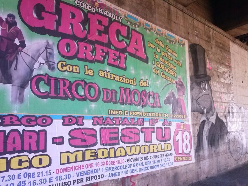 Ben 14 artisti avevano ridato colore alle grigie pareti lungo la pista ciclopedonale che da Su Siccu porta al parco di Molentargius, nei pressi dello stadio Sant’Elia e di Ponte Vittorio. E proprio nelle vicinanze del dipartimento di Biologia Animale ed Ecologia dell’Università di Cagliari parte delle opere son state coperte da un grande cartello pubblicitario, dimensioni 6×3 metri, di uno dei tanti circhi che ogni anno, nel periodo invernale, svolge le proprie attività a Cagliari e nell’hinterland.