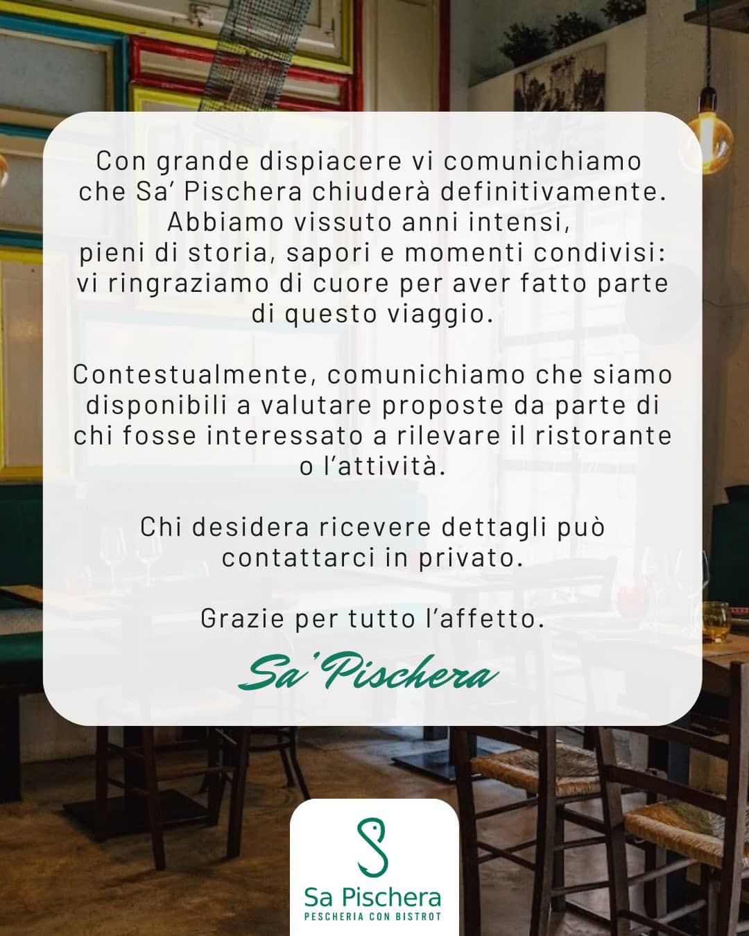 Cagliari, la lunga crisi dei ristoranti: chiude anche Sa Pischera nel cuore della Marina. Un commovente messaggio di addio dai gestori ai clienti”Con grande dispiacere vi comunichiamo che Sa’ Pischera chiuderà definitivamente.