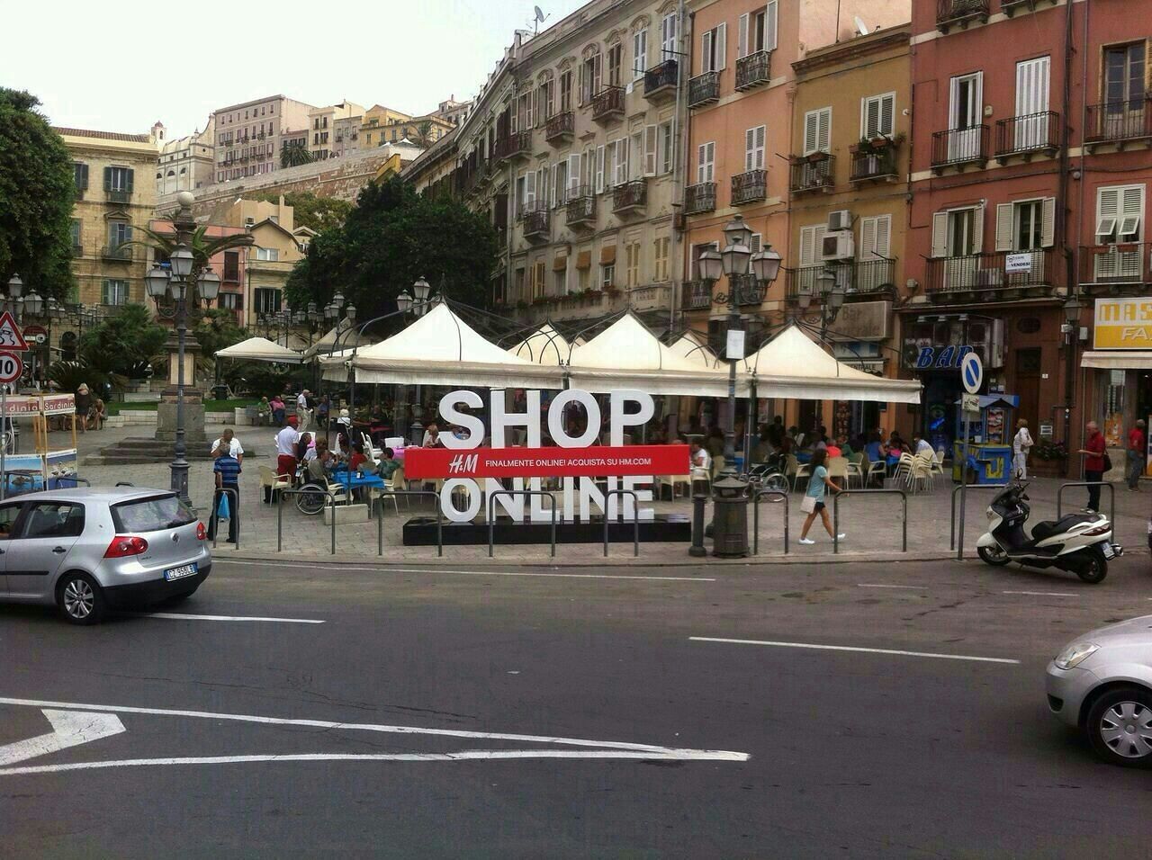 “Da oggi anche la statua di Carlo Felice può godere dell’antiestetica, grossa e invadente insegna pubblicitaria (alta circa metri 1,80, lunga metri 2,00, profonda cm. 50 di colore bianco e rosso) del colosso svedese che pubblicizza vendite on-line a discapito della economia locale”. I commercianti del centro città tornano all’attacco, dopo aver denunciato la settimana scorsa la presenza di una mega insegna pubblicitaria H&M posizionata in piazza Costituzione, e da alcuni giorni spostata in piazza Yenne.