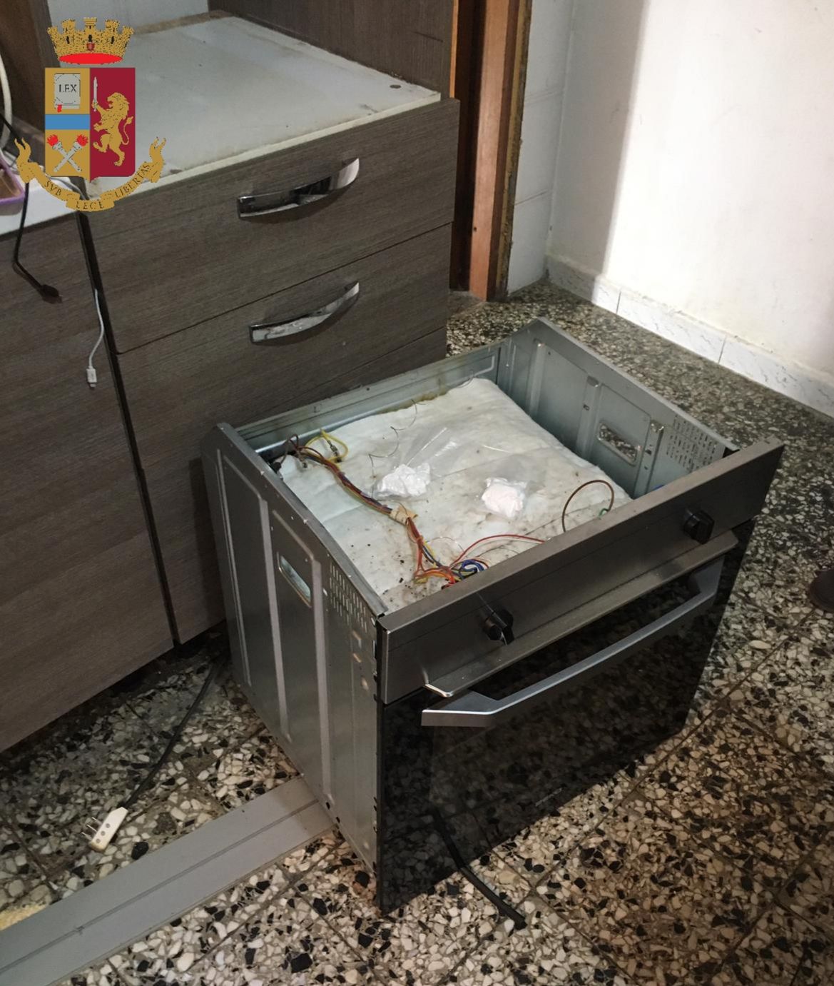 In particolare, una volta sfilato dal proprio alloggiamento il forno incassato ed estratto il coperchio in lamiera, i poliziotti hanno trovato all’interno due involucri sottovuoto di cocaina, per un peso lordo complessivo di g. 107,60.