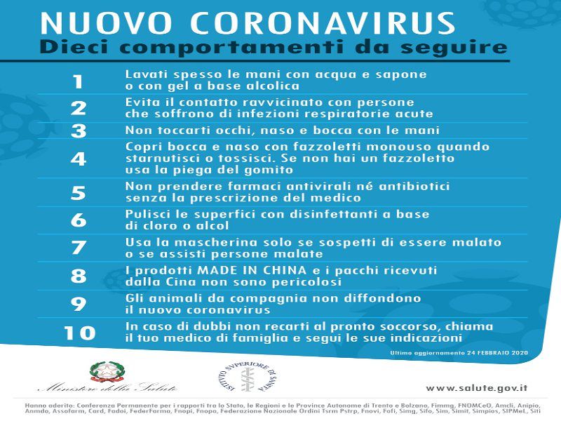 Dieci punti contenenti regole, consigli e le immancabili “bufale”, tutti legati al Coronavirus. Meglio, a come evitarlo e combatterlo: la locandina ufficiale, con tanto di logo del ministero della Salute, è stata diramata dal sindaco di Cagliari Paolo Truzzu, che ha lanciato un invito a tutti i proprietari di locali pubblici: “Stampate e affiggete in modo ben visibile la locandina sui comportamenti da seguire per prevenire il contagio e la diffusione del Coronavirus”. Un appello, quello di Truzzu, fatto anche a chi dirige luoghi di culto, scuole e Università :”L’affissione della locandina non comporta nessuna spesa”. Si tratta di azioni semplici, ma che richiedono una condotta lineare, diffusa e costante, quelle riassunte dalle autorità sanitarie competenti: spazio anche ai suggerimenti per evitare false paure e consigli operativi in caso di legittimo sospetto della presenza di un contagio.