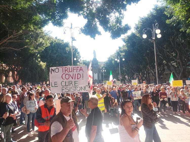 Cartelli contro “il green pass”, la “dittatura sanitaria”, “l’infamia della tessera verde” che è “dittatoriale e disumana”. A Cagliari esplode la protesta dei no green pass nel primo giorno con l’obbligo, in tutta Italia, della certificazione verde per poter lavorare. Più di mille persone si sono ritrovate in piazza del Carmine alla manifestazione organizzata da “Sa Defenza”, “Is pipius no si tocant”, le “partite Iva” e altri gruppi. I cartelli tenuti in mano sono, in gran parte, gli stessi delle altre proteste avvenute negli ultimi mesi. “Siamo contro il green pass, uno strumento dittatoriale e disumano. Lo stesso inventore dei tamponi ha detto che non dovevano essere utilizzati per fare diagnostica. Stanno creando una situazione di invivibilità, ci saranno situazioni difficili da un punto di vista sociale. Invito tutti i lavoratori a mettersi in malattia e non faccia il green pass o il tampone. Vogliamo incontrare l’assessore Mario Nieddu per spiegarli quanto sia errata la politica che stanno facendo sui vaccini, ci deve accogliere. Cambiamo strada e rotta, ci saranno anche proteste, continueremo. Ci auguriamo che oltre ai portuali di Trieste e Genova si uniscano anche quelli di Cagliari”. L’incontro con Nieddu, alla fine, non c’è stato, ma i manifestanti si sono ritrovati lo stesso sotto l’assessorato regionale della Sanità. In piazza presenti tanti giovani, ma anche sessantenni o settantenni. Dal palco improvvisato, sopra una delle panchine, hanno parlato anche insegnanti e studenti: “Non possiamo insegnare e non possiamo fare sport perchè non abbiamo il green pass, non essendo vaccinati. Questa è discriminazione”.