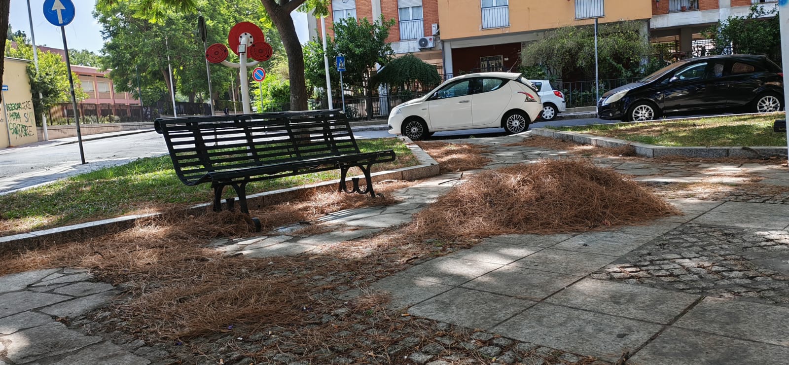 Cumuli di aghi di pino abbandonati tra le panchine e lungo i marciapiedi, in una delle piazzette del quartiere Is Mirrionis a Cagliari. Succede in piazza Paese di Desulo, dove la situazione di trascuratezza ha spinto un residente, Gabriele, a segnalare il problema: “Ma gli operatori ecologici, sono in ferie?”. Siamo al 28 luglio e la piazza si presenta con ampie distese di aghi secchi, facilmente infiammabili: “Poi quando arriva il disastro, ci domandiamo perché. In questo caso basta una sigaretta spenta male per provocare qualcosa di brutto, da far disperare le persone!”, aggiunge. Il cittadino lancia un appello al Comune affinché si intervenga tempestivamente per evitare il peggio: “Mi domando, non è meglio sempre prevenire?”. Una richiesta semplice, ma urgente, mentre il rischio incendi resta alto e la manutenzione ordinaria sembra essersi fermata.