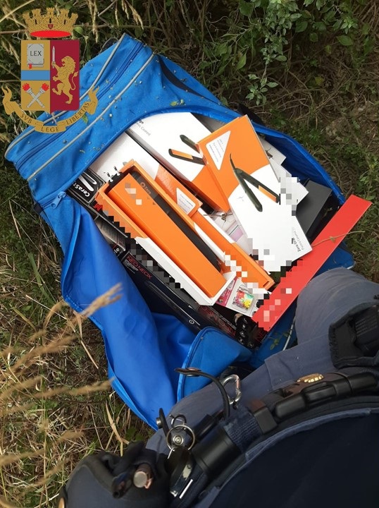 I poliziotti hanno recuperato altra parte degli oggetti rubati, all’interno di un borsone, nascosto tra l’ebra alta di un campo incolto, adiacente ad uno dei due negozi.