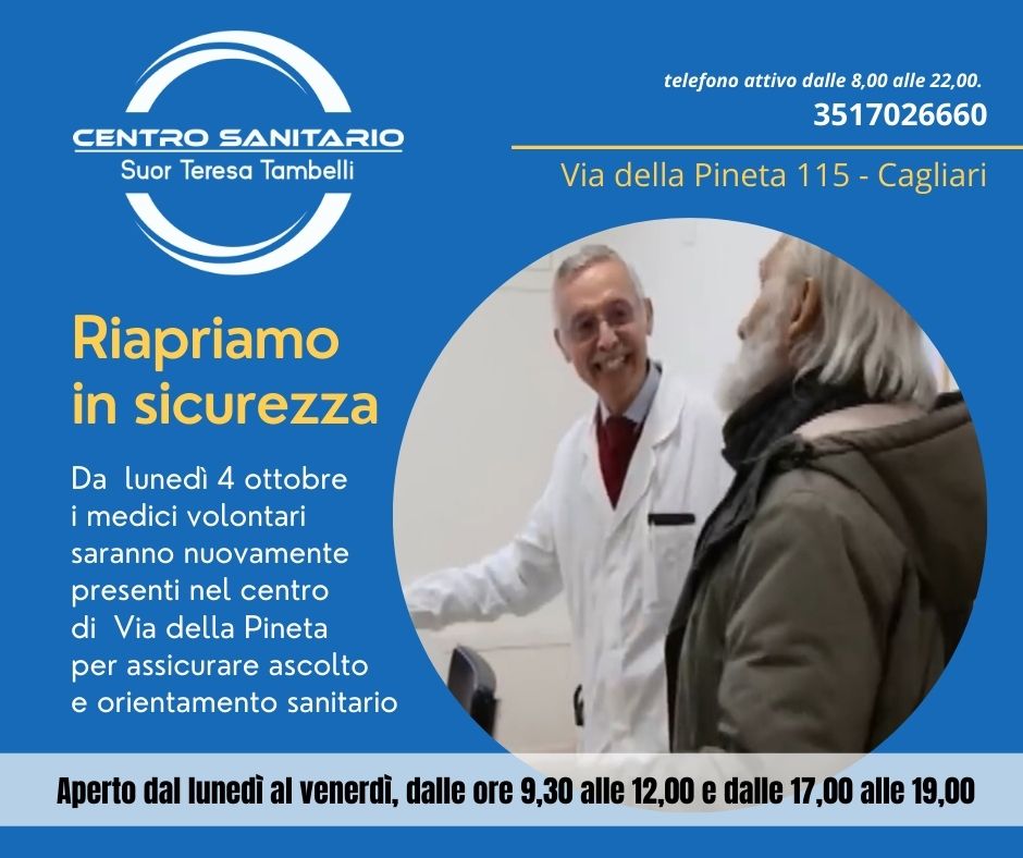 A partire da lunedì 4 ottobre, suore infermiere e medici volontari, saranno nuovamente presenti nella sede di via della Pineta 115 a Cagliari, dal lunedì al venerdì, dalle 9.30 alle 12.00 e nel pomeriggio dalle 17.00 alle 19.00.