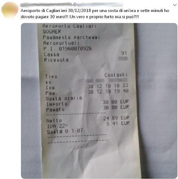 “Aeroporto di Cagliari ieri 30/12/2018 per una sosta di un’ora e sette minuti ho dovuto pagare 30 euro!!! Un vero e proprio furto ma si può?!!!”. A chiederselo, con tanto di scontrino pubblicato sul suo profilo Twitter, una donna cagliaritana, G.B. C’è l’orario di ingresso e quello di uscita, sessantasette minuti tondi. E, in fondo al ticket, il totale da pagare: trenta euro tondi tondi. La polemica corre sul web, dopo il “cambio di rotta” della Sogaer proprio sui parcheggi a pagamento. Se uno entra e esce per più di tre volte dalle sbarre dell’aeroporto con l’automobile senza parcheggiare, nell’arco di 24 ore, deve pagare quindici euro.