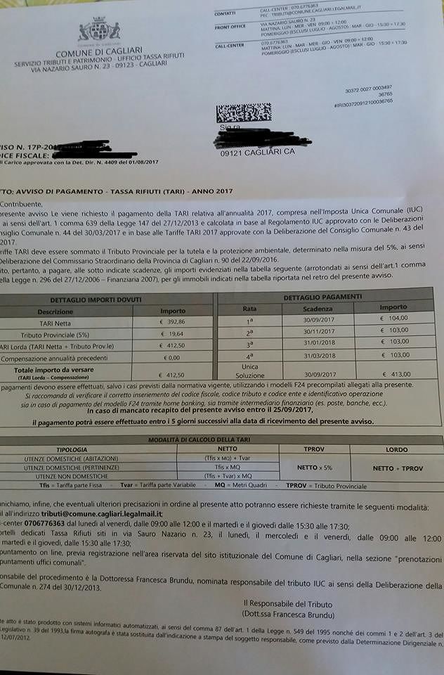 Cagliari, la città delle tasse record dei rifiuti: 413 euro per una coppia che vive in 80 metri quadri, il salasso della nettezza urbana. La nostra lettrice Tiziana spiega: “Caro Sindaco Zedda e giunta comunale al seguito, ho appena ricevuto la “farfallina” da pagare di 413,00€ relativa alla Tari (ovvero tassa sui rifiuti)… e mi chiedo… Ma state dando tutti di matto???? Come si può far pagare ad un nucleo familiare con due soli componenti e per un modestissimo appartamento di soli 80 mq (a ripeto appartamento non mega villa!!!!) una cifra simile???
