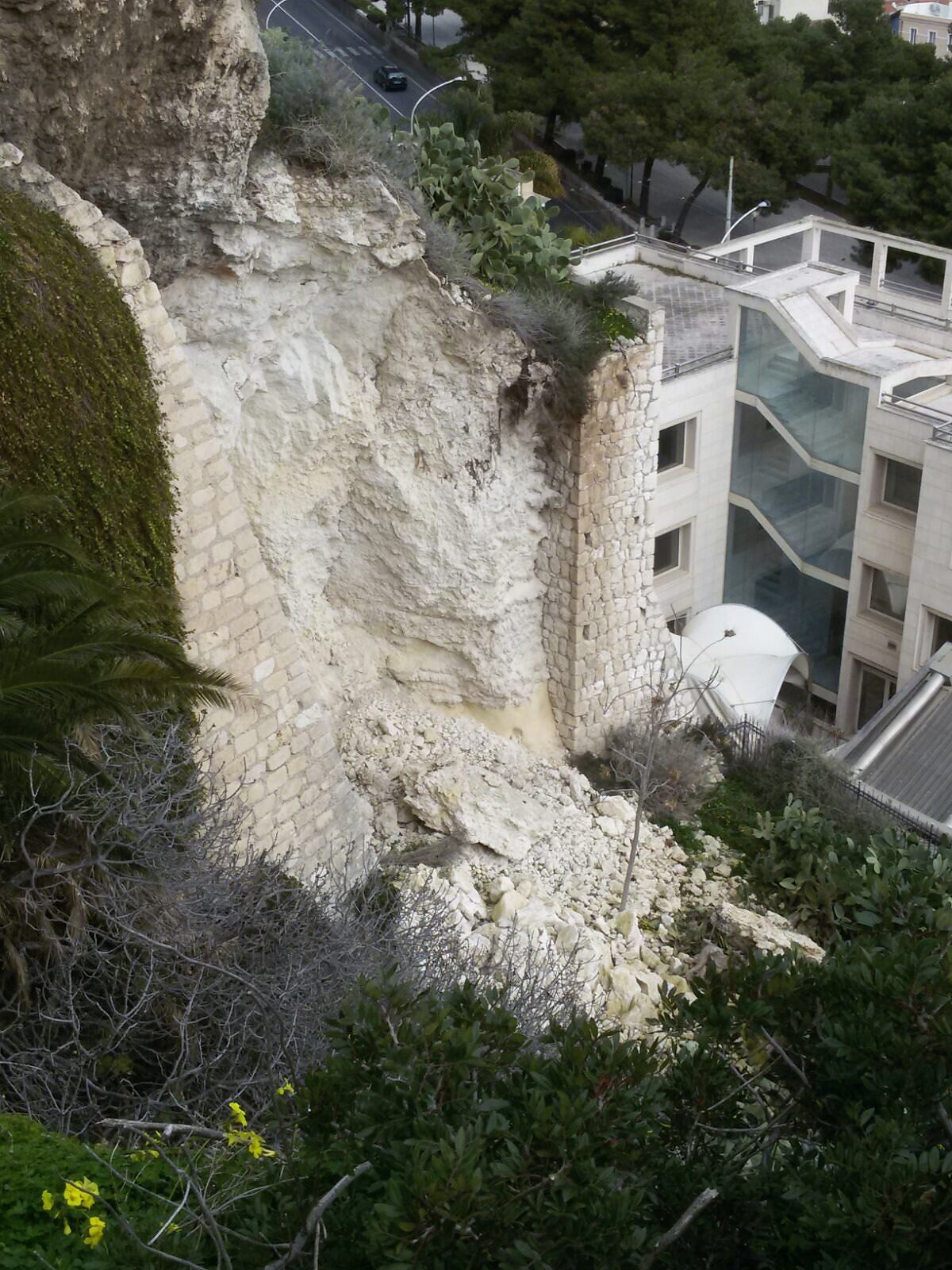 Grandi massi in caduta libera, pari a tonnellate di roccia calcarea ora visibile sotto l’antica Torre di Santa Lucia. Accade a Castello, dove una porzione dello stesso sta crollando.