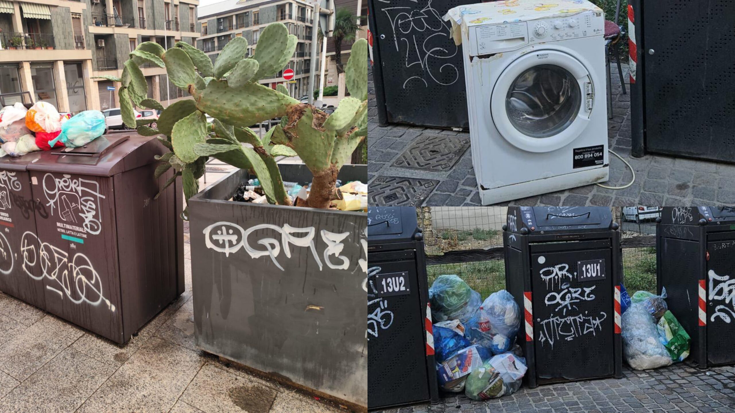 Cagliari, cartoline di degrado dal Corso Vittorio Emanuele: rifiuti ovunque anche dentro le fioriere e, come se non bastasse, in mezzo al marciapiede una vecchia lavatrice. “Amministratori, Cagliari non è solo zona rossa”.
