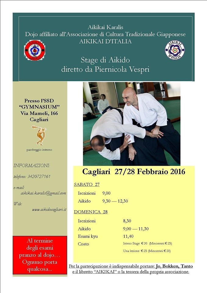Sabato 27 febbraio e domenica 28 febbraio si terrà a Cagliari uno stage di Aikido in via Mameli n. 166, presso l’A.S.D. Gymnasium.