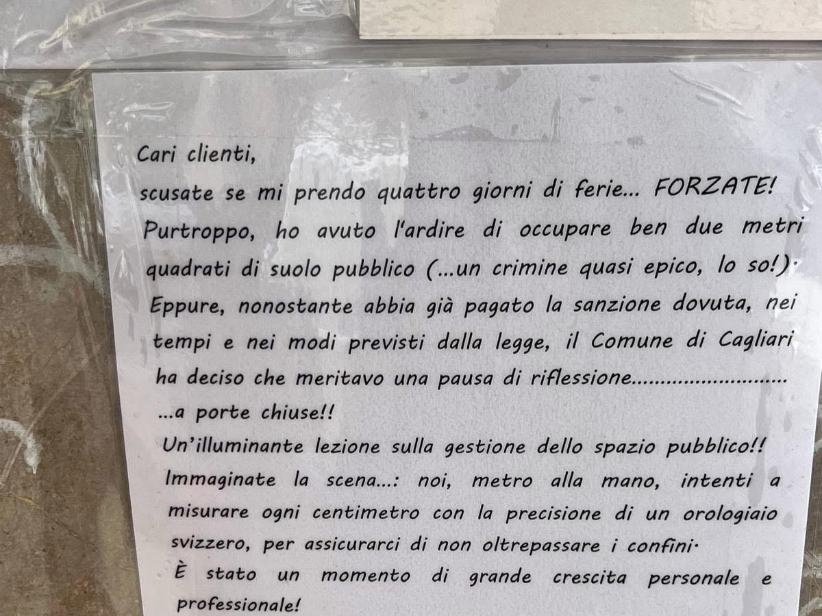 Cagliari, una chiusura forzata di quattro giorni per aver occupato due metri quadrati di suolo pubblico. È questa la disavventura burocratica che ha colpito un’attività commerciale della città, costretta a fermarsi nonostante avesse già pagato la relativa sanzione. La vicenda è stata raccontata direttamente dai titolari del negozio in un cartello affisso all’ingresso, in cui si legge con un tono tra l’ironico e l’amareggiato: “Ho avuto l’ardire di occupare ben due metri quadrati di suolo pubblico… un crimine quasi epico, lo so!”. Nonostante il pagamento della multa nei tempi e nei modi previsti dalla legge, il Comune di Cagliari ha deciso per una “pausa di riflessione”… a porte chiuse. Nel messaggio, i gestori descrivono la scena surreale in cui si sono trovati a misurare ogni centimetro del loro spazio con “la precisione di un orologio svizzero”, per evitare nuove infrazioni. Una situazione che definiscono un momento di “grande crescita personale e professionale”, seppur imposta dalle circostanze. L’episodio solleva interrogativi sulle regole di occupazione del suolo pubblico e sulle rigidità della burocrazia locale. La chiusura temporanea ha certamente creato disagi ai clienti e ai titolari, che però rassicurano: “Torneremo presto, questa volta senza rischiare nuove emozionanti avventure burocratiche!”. La vicenda riapre il dibattito sulla gestione dello spazio pubblico e sulle difficoltà affrontate dai commercianti, spesso alle prese con normative complesse e applicazioni rigorose che possono impattare le loro attività.