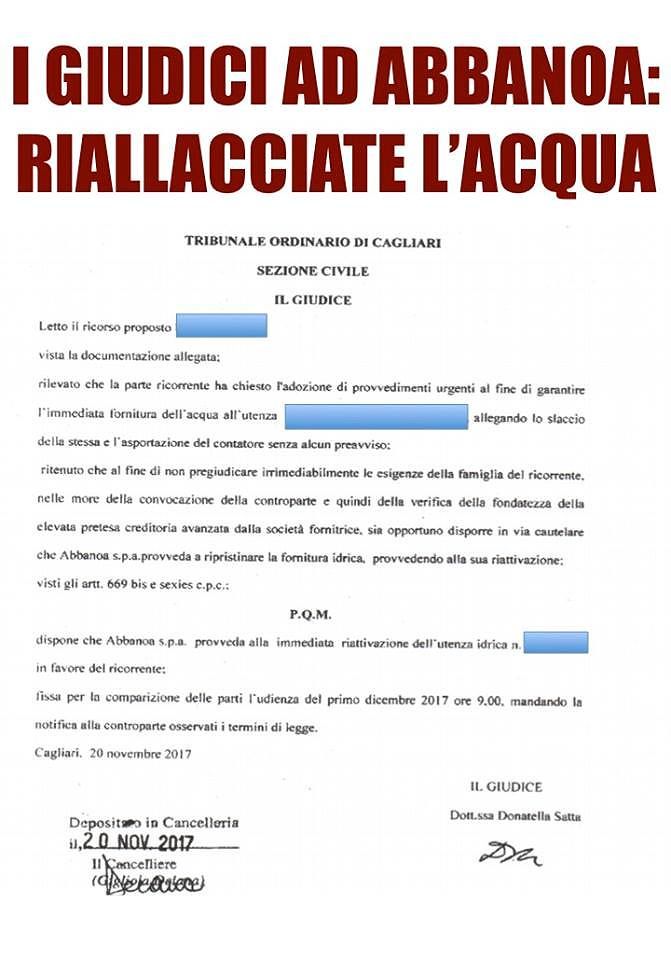 “I giudici ad Abbanoa: riallacciate subito l’acqua, non potete slacciare un bene essenziale. Ecco la sentenza appena notificata ad un cittadino che aveva subito l’arroganza e la spregiudicatezza di Abbanoa”, il deputato Mauro Pili torna ad attaccare l’ente gestore dell’acqua in Sardegna e pubblica sulla sua pagina Fb una sentenza che farà discutere. La sentenza è stata emanata a Cagliari e ordina ad Abbanoa di ripristinare subito l’acqua “per non pregiudicare irrimediabilmente le esigenze della famiglia ricorrente”. Il contatore era stato asportato “senza alcun preavviso”, si legge nella sentenza.