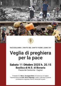 La Chiesa di Cagliari raccoglie l’invito di Papa Leone XIV e si unisce in preghiera per implorare il dono della pace, in un tempo segnato da conflitti, violenze e sofferenze che colpiscono intere popolazioni in diverse parti del mondo. Sabato 11 ottobre 2025, alle 20.15, nella Basilica di Nostra Signora di Bonaria si terrà la Veglia di preghiera per la pace presieduta dall’Arcivescovo monsignor Giuseppe Baturi. Un momento comunitario di invocazione e di testimonianza che coinvolgerà fedeli, sacerdoti, religiose e religiosi, movimenti e associazioni ecclesiali. Offrirà la propria testimonianza il medico congolese Denis Mukwege, Nobel per la pace 2018.