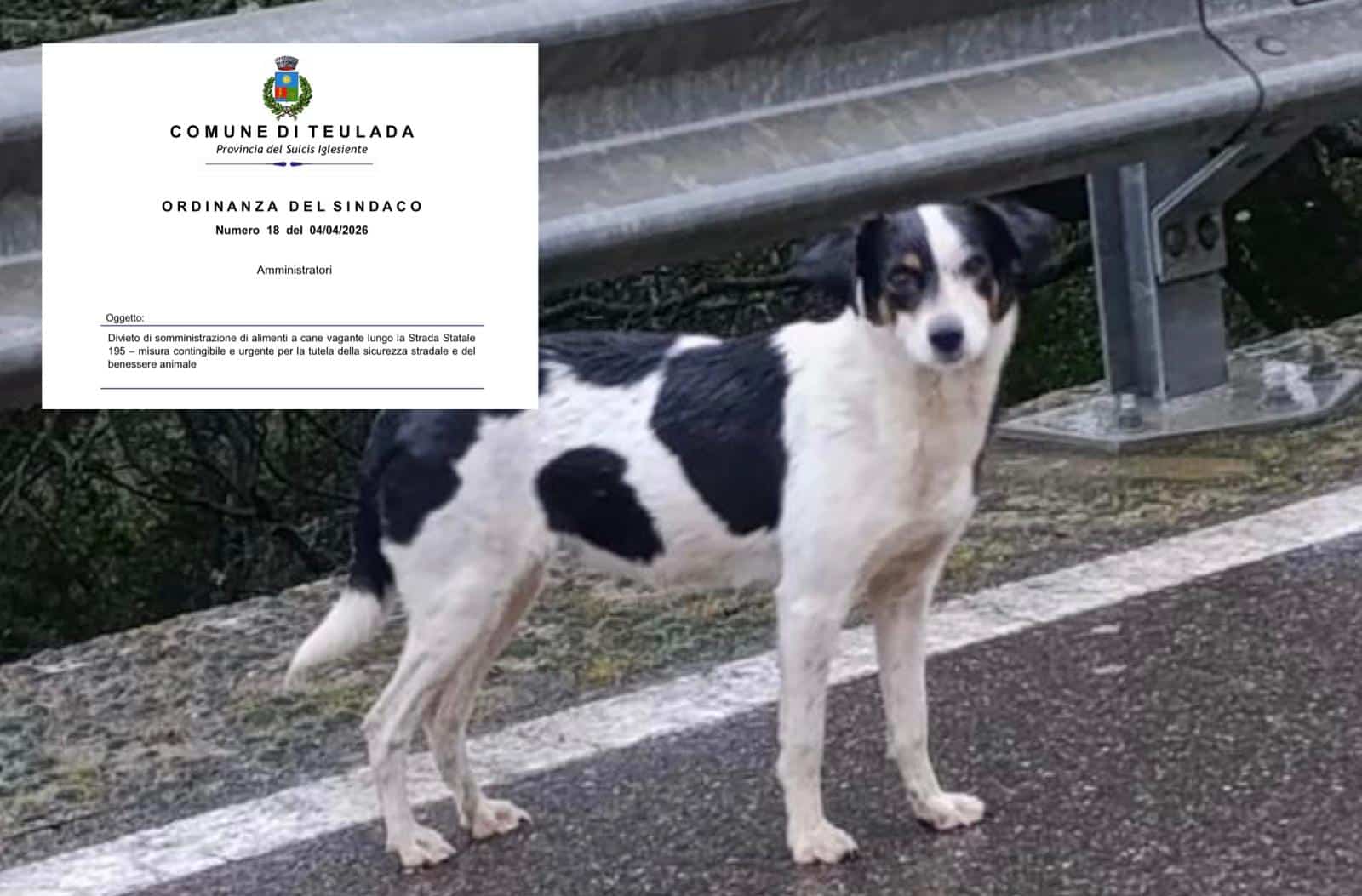 Invece di salvarla spostandola in una struttura dove garantirle assistenza e cure, il Comune di Teulada vieta con un’ordinanza firmata questa mattina dal sindaco Milìa di dare cibo e acqua a Ondina, una sfortunata cagnolina che da mesi vaga sola e spaventata al freddo, fra le montagne di Teulada e Domus De Maria, lungo la statale 195. A quanto pare, il Comune così come i barracelli e la Asl, non hanno i mezzi adeguati per catturare Ondina e portarla al sicuro. E dunque, incredibile ma vero, la soluzione per il Comune è ordinare di smettere di darle da mangiare e da bere per farla spostare alla ricerca di cibo altrove e garantire così l’incolumità degli automobilisti. Condannandola, di fatto, a morire di stenti.