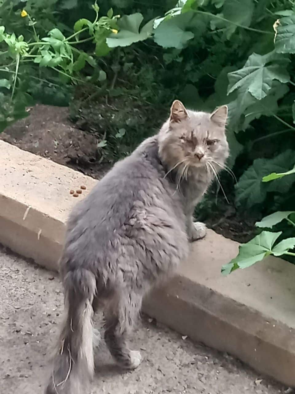 Un meraviglioso micione adulto dal pelo grigio semi-lungo, trovato in condizioni disperate: addome gonfio, occhi infetti e un quadro clinico critico.