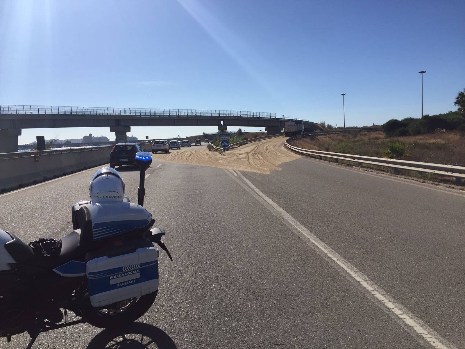 Intervento della Polizia Municipale sulla strada Sulcitana all’altezza del km 2, allo svincolo per il Porto Canale, in direzione Cagliari, dove un autoarticolato ha perso il carico di orzo.