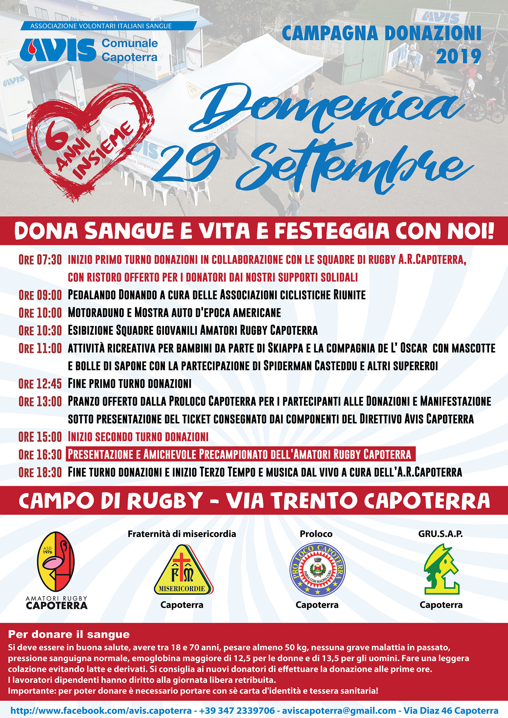 L’Organizzazione di Volontariato Avis Comunale di Capoterra, impegnata nella promozione e nella valorizzazione della solidarietà umana, organizza la festa dei 6 anni di attività Avis Capoterra per il prossimo 29 settembre. La manifestazione si svolgerà dalle 7.30 alle 19 presso il campo da Rugby a Capoterra in via Trento.