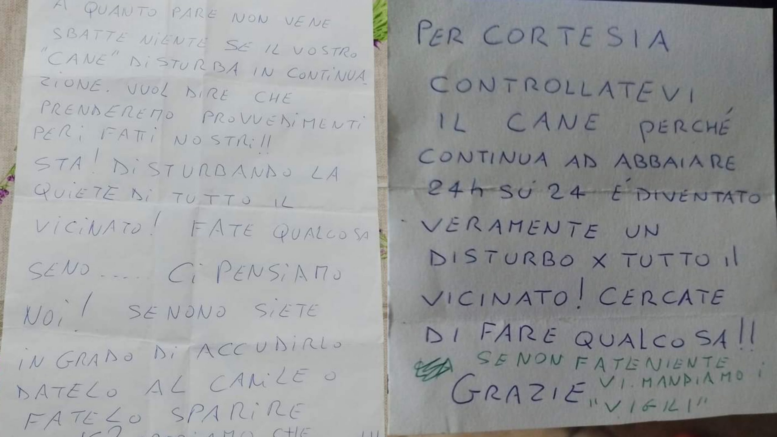 Due lettere anonime indirizzate a chi si prende cura di un simpatico esemplare, accudito e coccolato come un vero e proprio membro della famiglia. Accusato di abbaiare troppo sia di giorno che durante la notte, il mittente minaccia senza mezzi termini di prendere provvedimenti: un chiaro invito a sbarazzarsi del cane, altrimenti “ci pensiamo noi”.