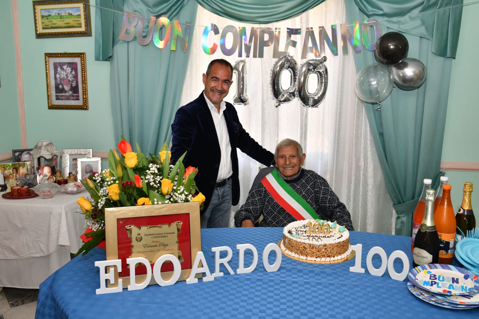 Capoterra in festa per un nuovo centenario: Edoardo Putzu si aggiunge, così, alla già lunga lista di chi vive da 100 anni e più. Immancabili gli auguri da parte del sindaco Beniamino Garau che, a nome di tutta la comunità, ha partecipato questa mattina alla festa. Un omaggio consegnato direttamente al festeggiato, torta, fiori e palloncini hanno fatto da cornice a dolcetti e bottiglie da stappare. Il sorriso di tizu Edoardo immortalato nella foto di rito, immancabile, con la fascia tricolore al petto. Ha iniziato a lavorare dall’età di 13 anni fino ai 18 dai Marchesi di Villad’Orri.