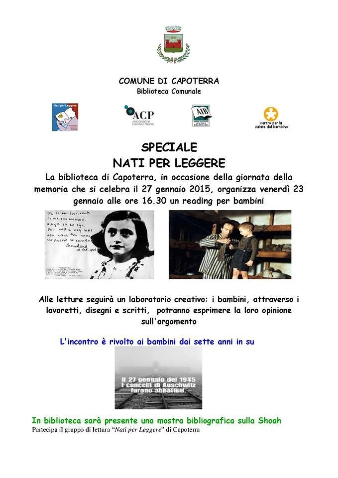 23 Gennaio, la Biblioteca Comunale di Capoterra anticipa la Giornata della memoria con un reading dedicato ai bambini In occasione della Giornata della Memoria che si celebrerà il prossimo 27 Gennaio, la Biblioteca Comunale di Capoterra ,per il giorno Venerdì 23 Gennaio, organizza un reading per bambini, dedicato ai piccoli dai sette anni in su, durante il quale sarà possibile ascoltare letture a tema Olocausto a misura di bambino.