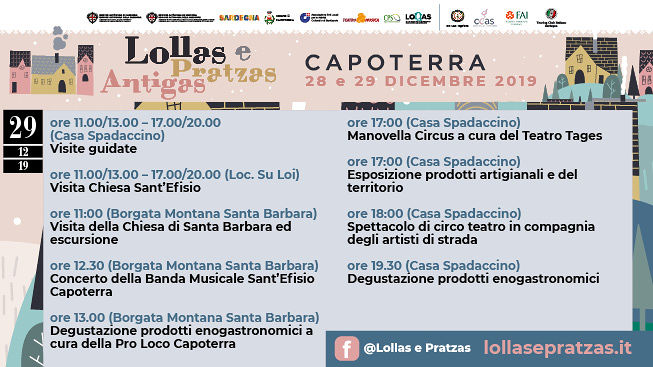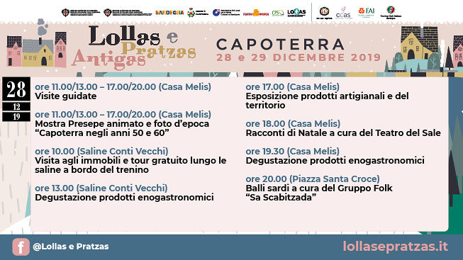Capoterra apre al pubblico le sue Lollas e Pratzas antigas: per due giorni, il 28 e il 29 dicembre, il paese si animerà con musica, eventi culturali, artigianato, laboratori enogastronomici e visite guidate. Un ricco programma che consentirà ai visitatori di poter ammirare le bellezze locali, come ad esempio Casa Melis – previsti ingressi dalle ore 11 alle ore 13 e dalle 17 alle 20 per entrambe le giornate – dove sarà allestita una bellissima mostra di foto d’epoca “Capoterra negli anni 50 e 60” e si potrà godere inoltre dello spettacolo del Presepe Animato, vera attrazione per adulti e bambini.