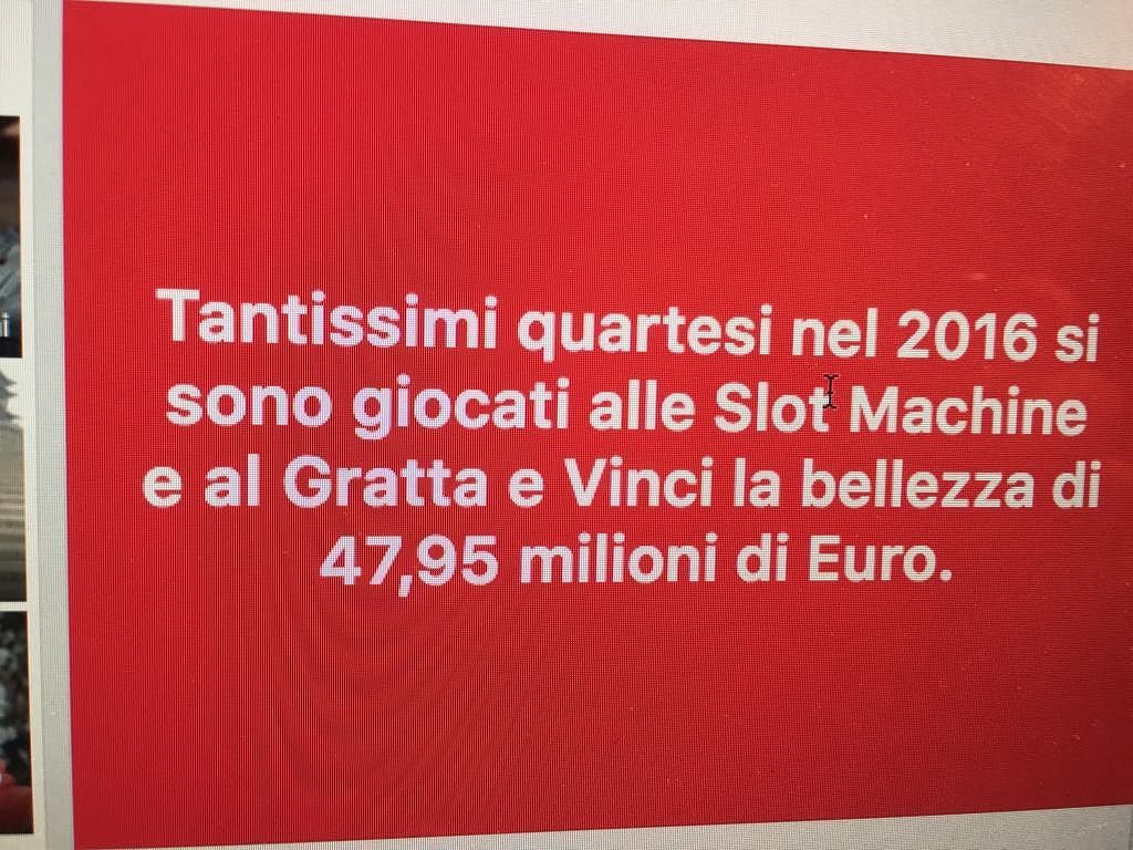 “Cari quartesi, vi siete giocati solo nel 2016 la bellezza di 47,95 milioni di euro tra Gratta e Vinci e Slot Machine”. Il sindaco Stefano Delunas lancia l’allarme ludopatia: si parla tanto di crisi, ma intanto la gente i soldi per giocare li ha eccome? “Il dato dei 47.95 milioni di euro considera che ciascuno dei 70.914 residenti ( dati dell’ultimo censimento ) abbiano giocato 676 euro a testa- spiega Delunas- ma il sottoscritto che non gioca d’azzardo vuol dire che un mio concittadino ha giocato anche per me la bellezza di 1352 euro. In città ci sono circa 300 slot machine. Tutti noi vediamo dappertutto operai, casalinghe, liberi professionisti, pensionati, disoccupati, utenti dei servizi sociali, giocarsi quel poco che hanno. Se avete un amico o un parente in queste condizioni ,contattate e collegatevi al sito facebook delle associazioni che si occupano di questo fenomeno. Le proposte di legge contro il gioco d’azzardo vanno approvate al più presto”, spiega ancora Delunas.