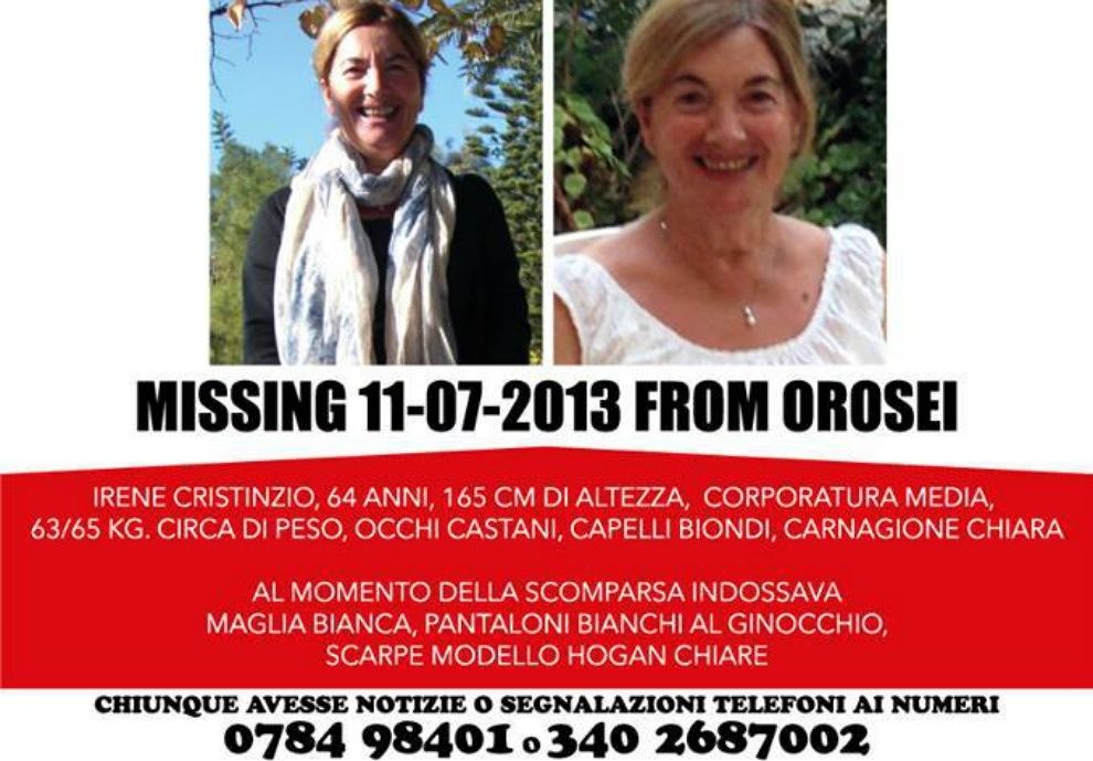 Read moreIrene Cristinzio, 64 anni, è scomparsa l'11 luglio ad Orosei, in provincia di Nuoro