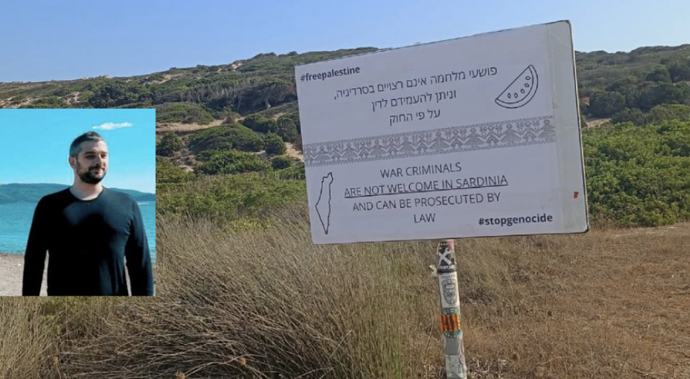 “Non ho neppure molto tempo da dedicare a questo e mi dispiace moltissimo. Quindi le 5 o 6 volte che sono andato in spiaggia negli ultimi mesi, ho pensato di rendermi utile portando in borsa qualche cartellone di una campagna in solidarietà con il popolo palestinese.”I criminali di guerra non sono benvenuti in Sardegna e possono essere perseguiti dalla legge” scritto bilingue, in ebraico e in inglese, perché è proprio ai criminali di guerra che vorrebbe rivolgersi.