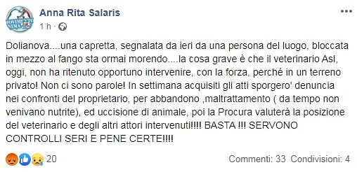 Le segnalazioni sono state fatte, ma nessuno sarebbe intervenuto. E una piccola capretta, a Dolianova, sta per esalare l’ultimo respiro: a denunciare il fatto, per prima, è stata una residente. C.M. La donna racconta di aver provato a contattare la polizia Municipale e l’Asl dopo essere stata attirata dai lamenti dell’animale e, contemporaneamente, ha inviato foto e video ad Anna Rita Salaris, a capo della sezione sarda del Movimento Animalista. Èd è proprio quest’ultima a promettere battaglia: “A Dolianova, una capretta segnalata da ieri da una persona del luogo è bloccata in mezzo al fango sta ormai morendo. La cosa grave è che il veterinario Asl non ha ritenuto opportuno intervenire con la forza perché in un terreno privato. Non ci sono parole. In settimana, acquisiti gli atti, sporgerò denuncia nei confronti del proprietario per abbandono, maltrattamento ed uccisione di animale”, scrive la Salaris. “Servono controlli e pene certe”, tuona l’animalista.
