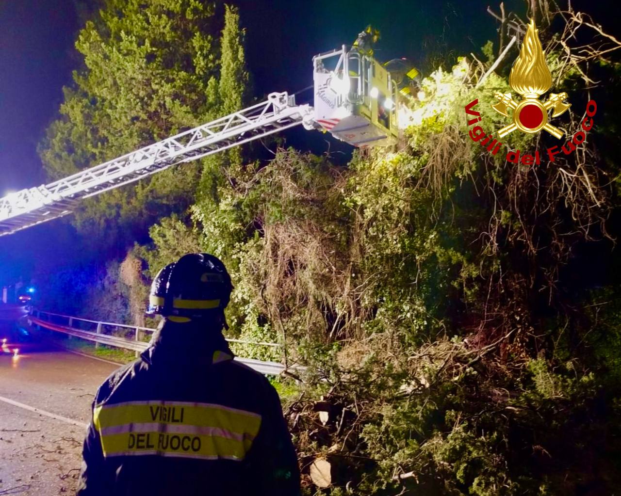 Sinnai, intervento dei Vigili del fuoco di Cagliari, intorno alle 19:30 di ieri, per la rimozione di un albero che a causa del maltempo di questi giorni si era inclinato pericolosamente sulla sede stradale della NSA371 (ex SS125) all’altezza del Km 26+900.
